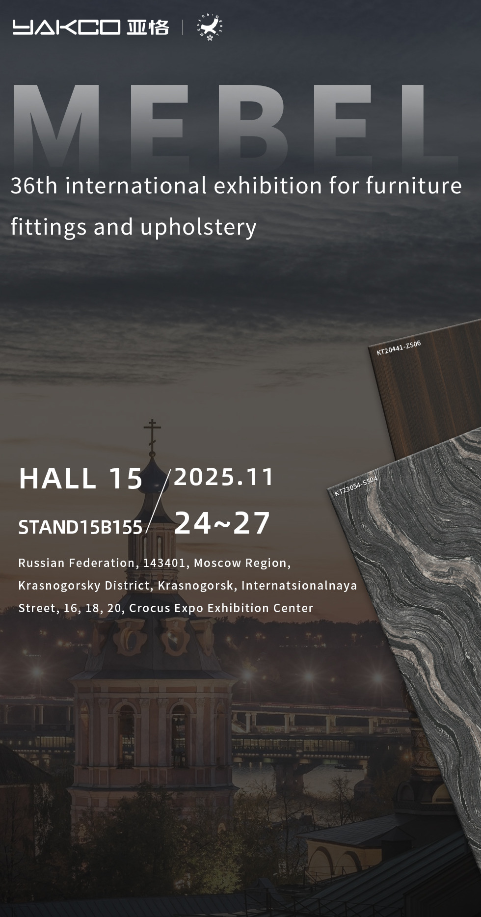 YAKCO New Materials (Jiangsu) Co., Ltd. oficiálne oznamuje svoju účasť na 36. medzinárodnej výstave nábytkového kovania a čalúnenia (MEBEL), ktorá sa bude konať v Moskve v Rusku. Výstava sa bude konať od 24. novembra do 27. novembra a spoločnosť privíta globálnych návštevníkov v stánku č. 15B155.